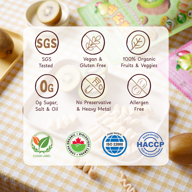 Our mission is simple: to create organic rice snacks that are as pure and natural as your little one deserves. Each cracker is made with real fruits and vegetables, so you can see and taste the goodness in every bite.